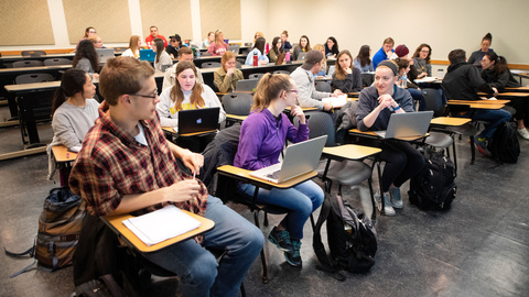 Undegraduate students working on laptops and engaging in discussion during a psychology course